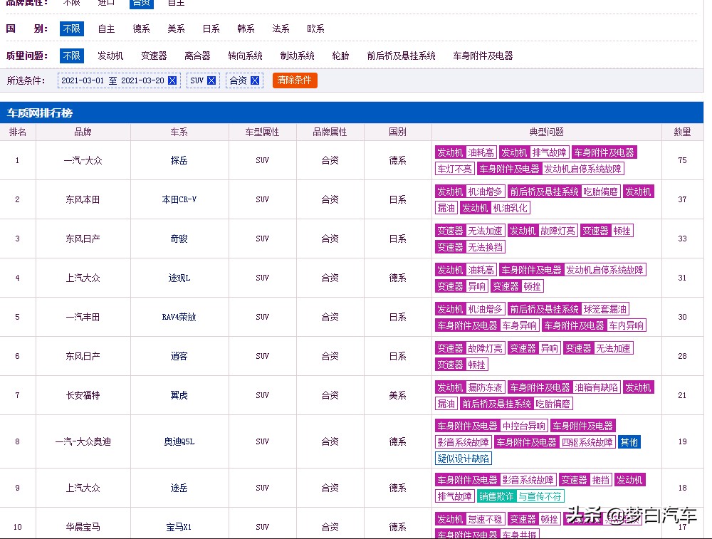 结合最新一期(3.1-3.20)的合资SUV质量投诉榜来看,投诉量排名前十的合资SUV,几乎都是日系车和德系车。具体来看,排名榜首的合资SUV是大众探岳,它近20天的投诉量高达75,而大众探岳的主要问题是排气故障、车灯不亮和发动机启停等。