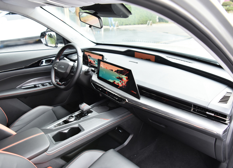 内饰方面,欧尚Z6的内饰以前卫、科幻风格为主,环抱式座舱线条简约,三块屏幕错落有致,中控台上方覆盖了大量软性搪塑材料,中间为贯穿式空调出风口,下方是银色拉丝面板,整套内饰没有丝毫廉价感。另外由于采用了电子挡把,因此中央通道下方区域做了掏空处理,里面配备了USB和12V充电接口,配合上方的无线充电板,可以实现主副驾驶位同时充电,这样的设计很实用。