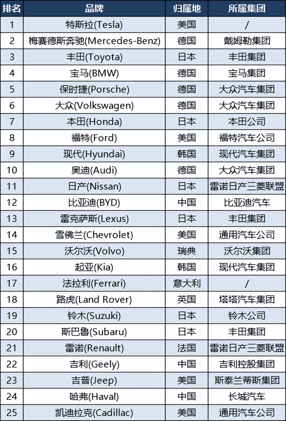 英国Brand Finance发布的“2023全球汽车品牌价值排行榜”出炉榜单显示,排名前十的汽车品牌为:特斯拉、梅赛德斯奔驰、丰田、宝马、保时捷、大众、本田、福特、现代、奥迪。