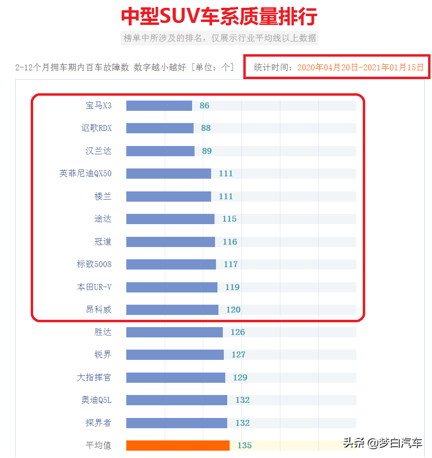 最后来看下2020年度中型SUV新车质量排名情况,根据公布的榜单来看,2020年度质量合格的中型SUV(合资)车型共有15款,而其百车故障数平均值为135个。具体排名方面,豪华中型SUV宝马X3夺得了质量冠军,宝马X3的总销量高达13.5万辆,所以宝马X3夺冠也是实至名归了。公认口碑不错的丰田汉兰达也是入榜前三,而且汉兰达的百车故障数仅比宝马X3多了3个。日产楼兰、本田冠道、本田UR-V和别克昂科威都是入榜前十,别克昂科威的市场表现最为亮眼,全年销量高达16.7万辆。另外,质量合格的中型SUV还有,福特锐界、奥迪Q5L以及雪佛兰探界者等车型,它们的百车故障数都不足135个。
